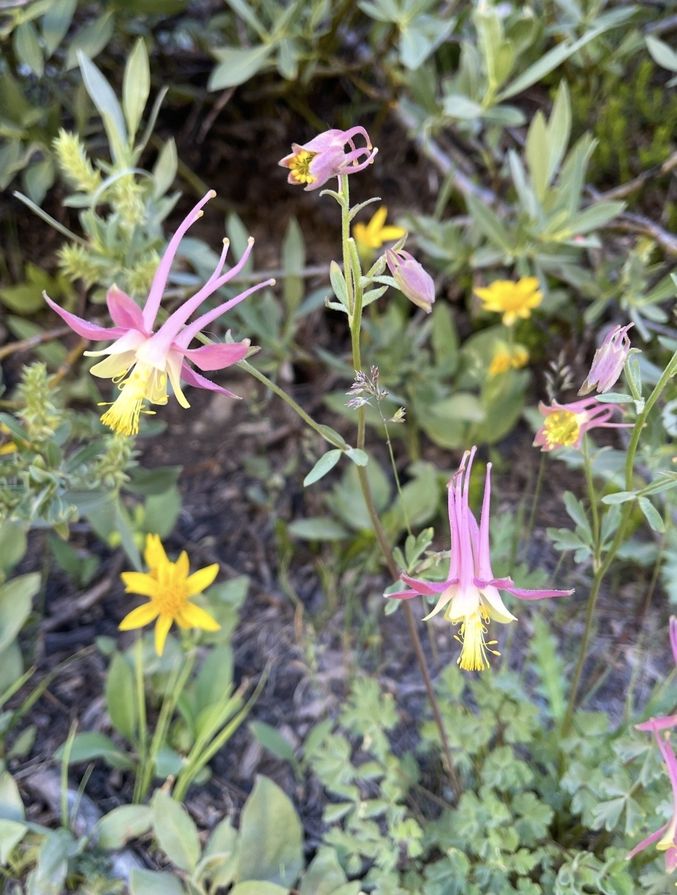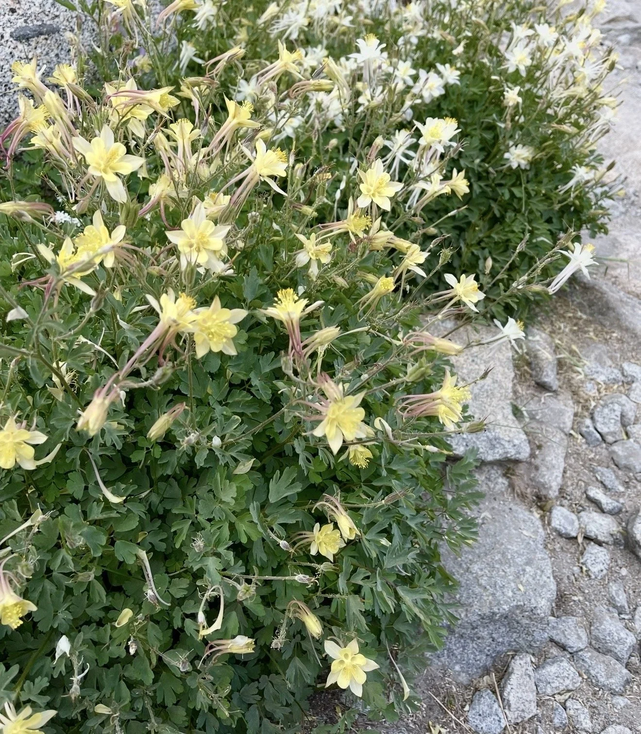 As I eagerly awaited signs of life as I carefully watered and monitored the sunshine that they were receiving, I thought about how maybe this would be the year that I would get the two varieties of wild columbine that I hoped for. The first, Western Columbine, is found in many shady damp places in the west. It’s vivid red colored flowers are a welcome sight on many of my favorite hiking trails. The other plant is the Sierra, or Colville, Columbine which is found in the high Sierra, generally from 8000-12000 foot elevation in rocky open slopes. It’s much less common and considered “vulnerable” in the conservation world. I’ve come across it only a handful of times due to high elevation narrow window of blooming. I’m absolutely charmed by its delicate beauty and perfect pastel colors ranging from cream to yellow to pink.